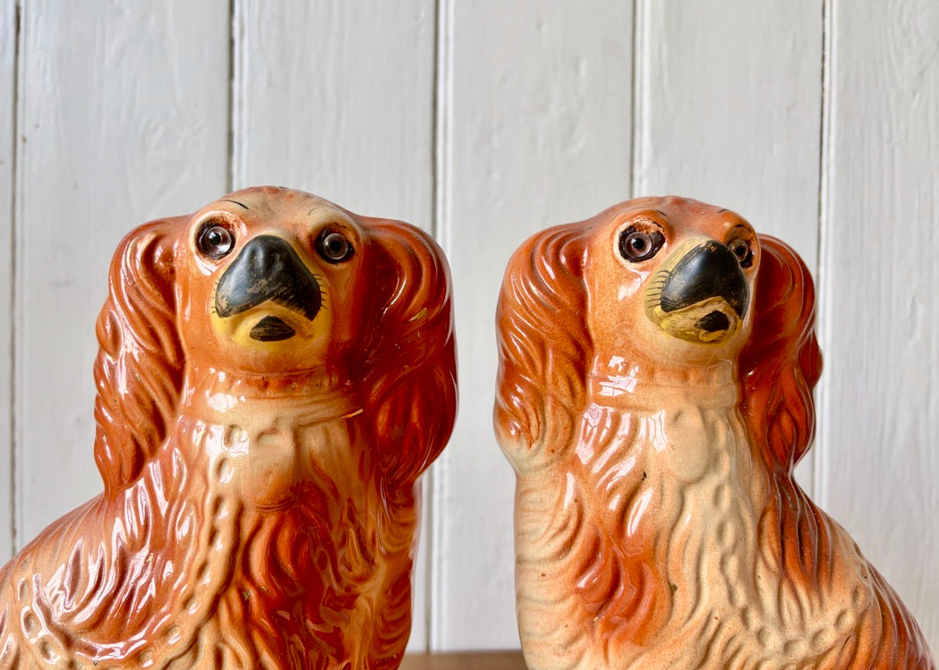 This antique pair of Staffordshire mantle dogs is chestnut and beautifully coloured with glass eyes!  Increasingly rare, they date from circa. 1890.