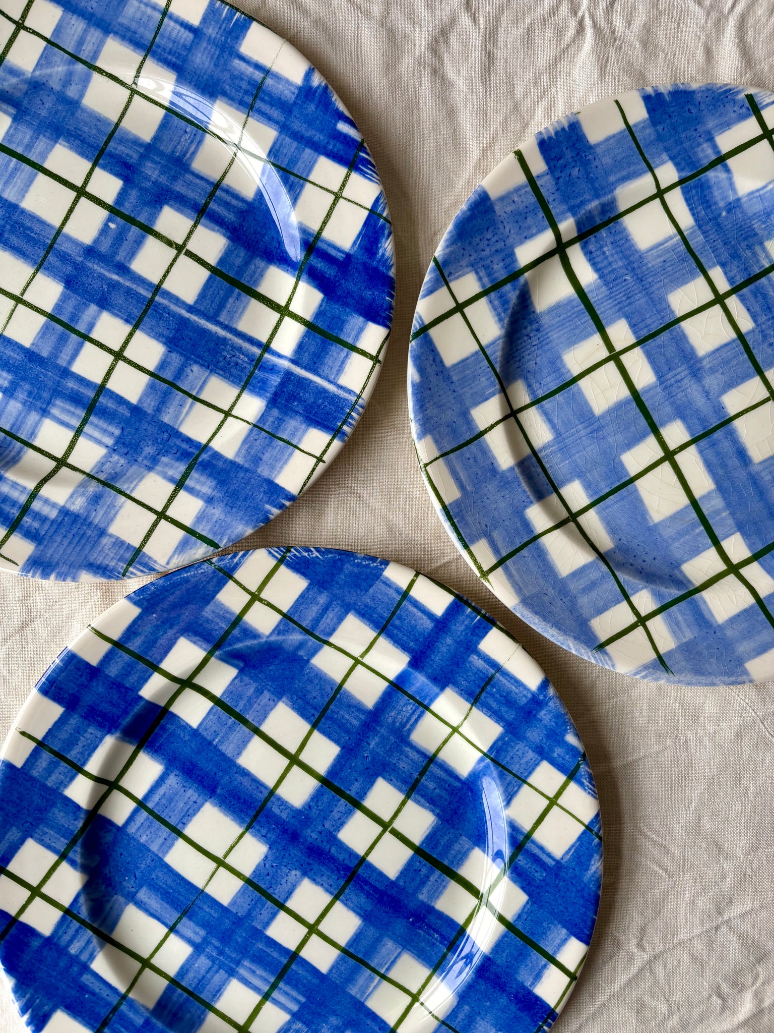 Perfect for casual lunches or summer suppers, these are a great option when entertaining friends and family this spring/summer.  Blue check with a green over-stripe, these are classic and contemporary at the same time.  As they are hand-decorated there is some variation between plates.