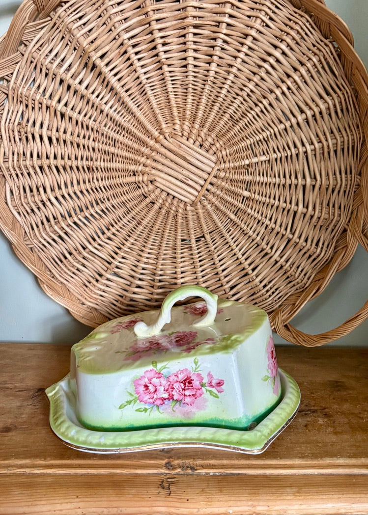 A useful and very decorative cheese cloche, perfect for keeping cheese at room temperature for lunches and suppers. An early transfer ware item, it features pink roses and is a perfect for the table or kitchen.