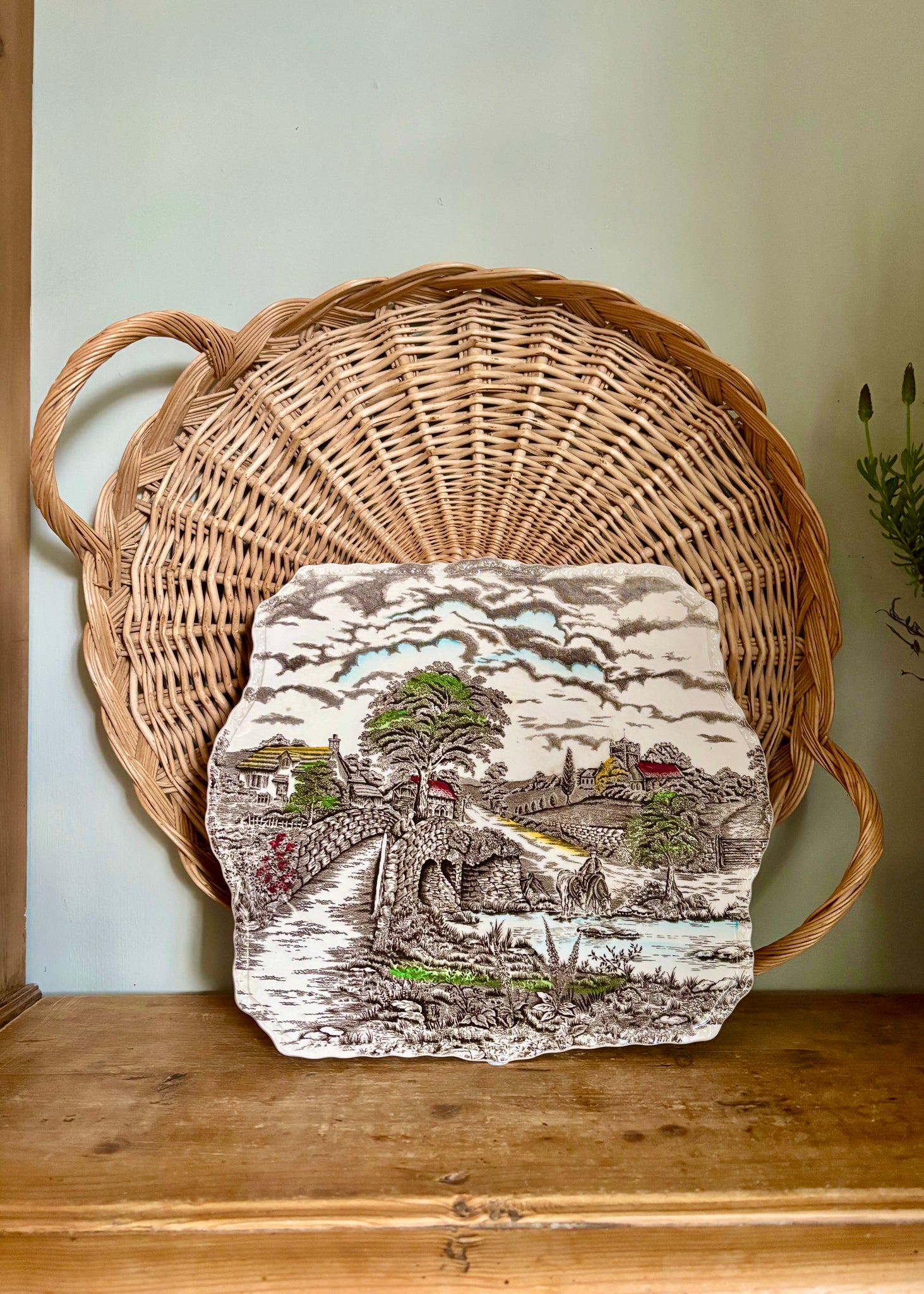 This hand engraved transfer ware old English scene is an atmospheric illustration in brown, greens, reds and autumnal tones. The detail is charming and this is a wonderful piece for display and would equally useful as a cheese or nibbles platter for entertaining. The border is embossed and gently scalloped.