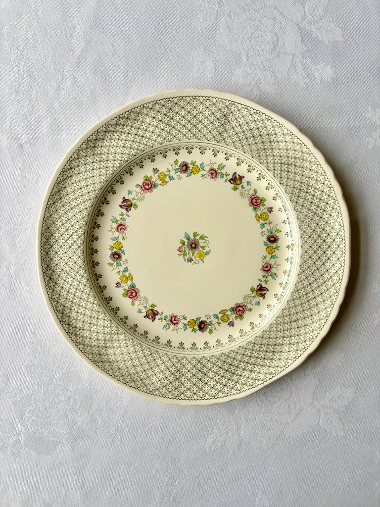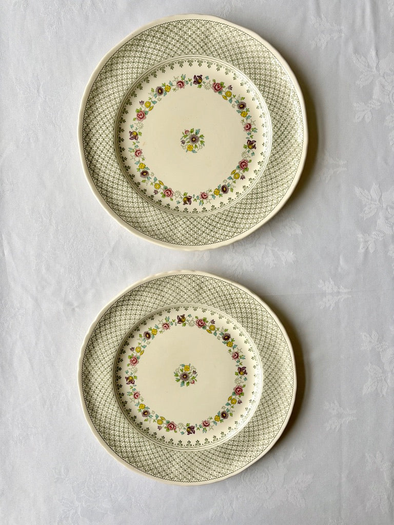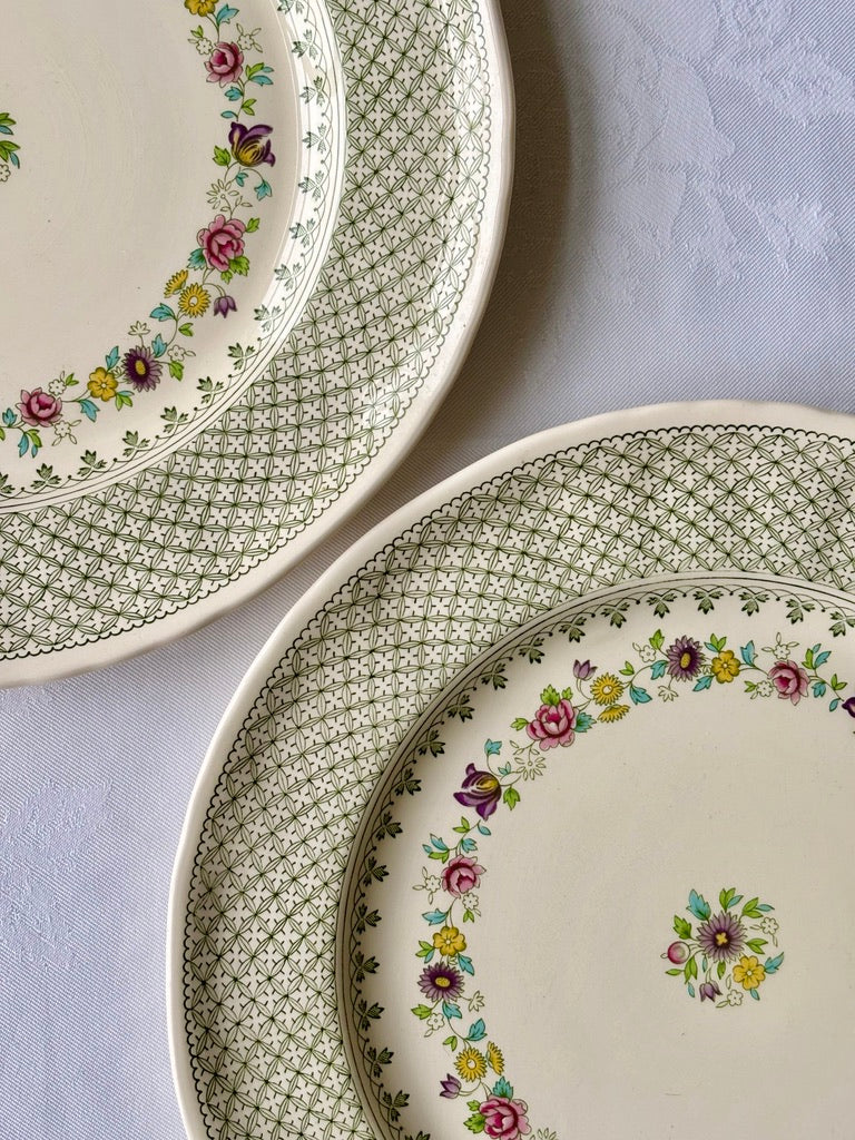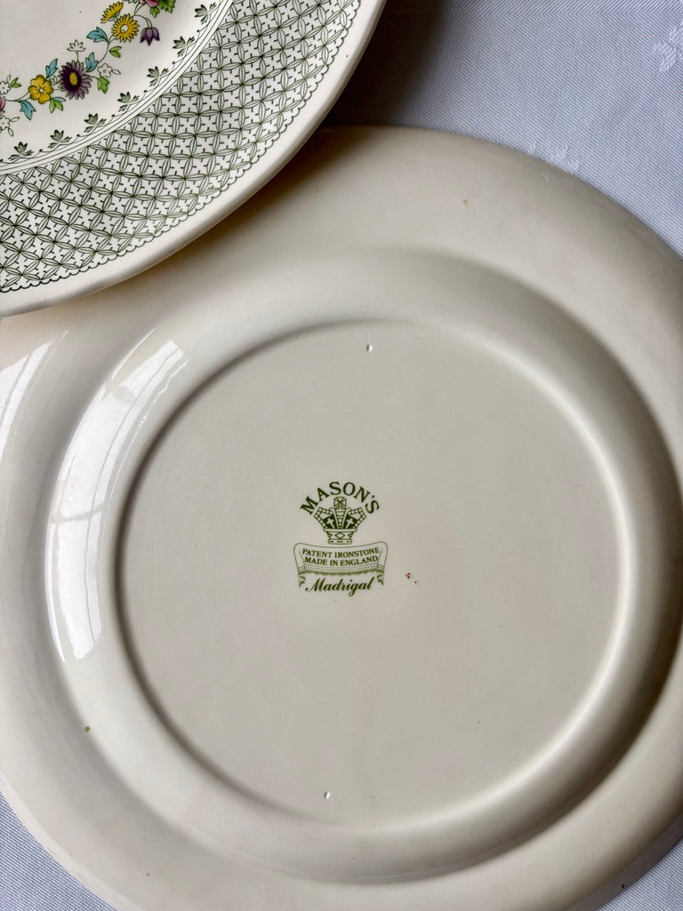 A pretty pair of Mason's Madrigal pattern plates. A lovely green lattice border with a garland of meadow flowers forming the main design. Super on a wall or dresser.