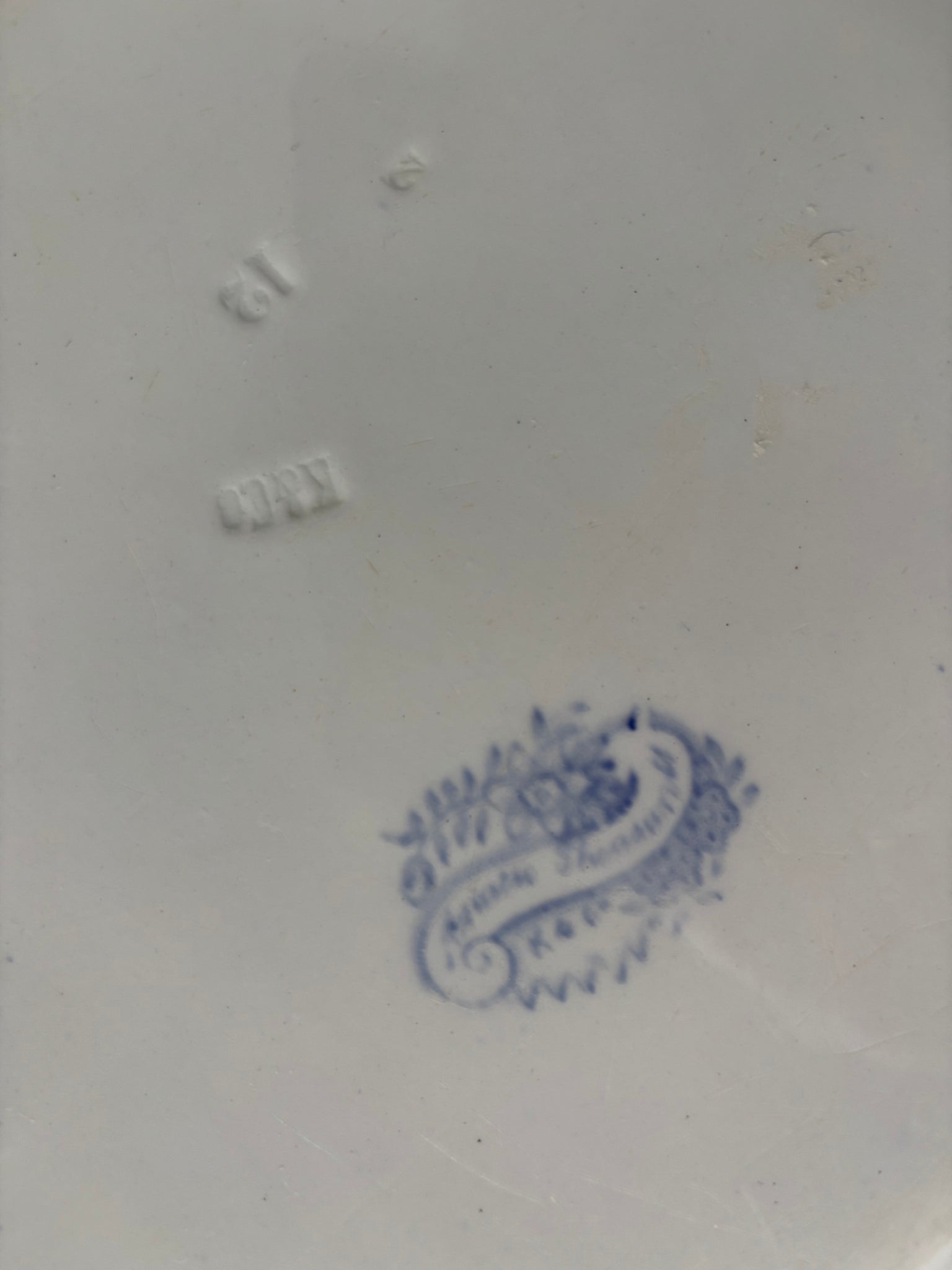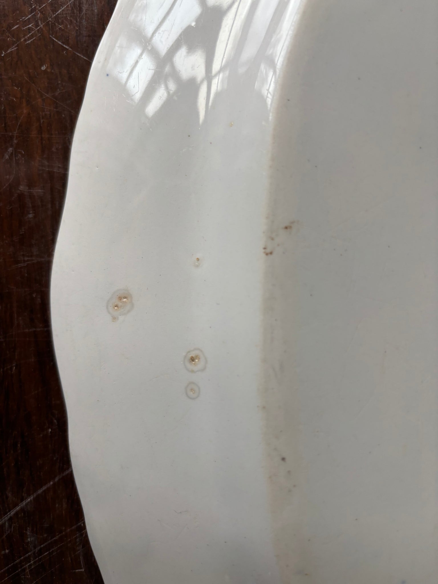 Dimensions: height 3.5cm at rim, length 33cm, width 27.5cm. Maker's mark on base. Minor age spots on reverse. One minute firing mark. No cracks and chips.