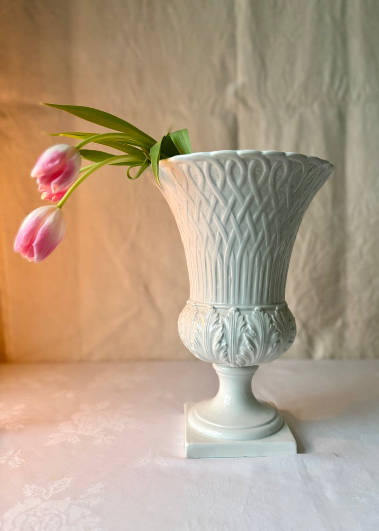 A classical urn style Italian vase with Acanthus leaf detailing set on a traditional pedestal.  A wonderfully decorative piece which is perfect for large arrangements this season.