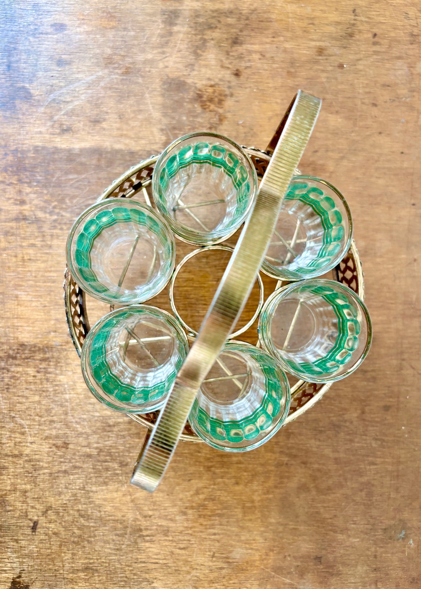 A pretty set of glasses with gilt and green banding decoration in a footed gilt stand with carry handle - ideal for your drinks tray this season!