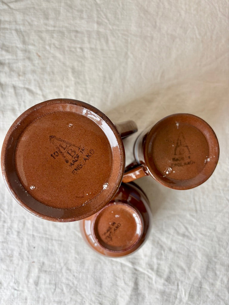 A stylish set of three earthenware pieces by A.L.B. Pottery, two jugs and a sugar bowl. A rich chocolate brown with sky blue and white banding on all three. The company started in 1919 and was famous for its non-drip teapots!