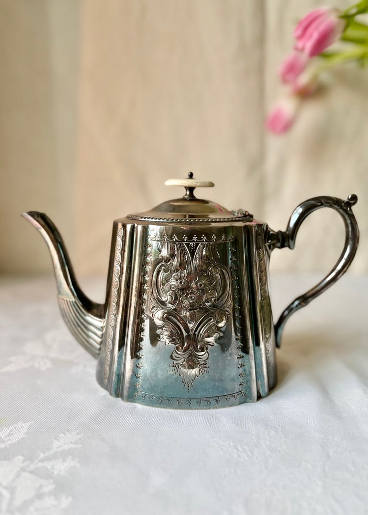This George III style elegant silver plate teapot was made by Daniel & Arter, based in Birmingham. It is oval in shape with straight sides which are fluted with an embossed and bright cut panel detailing. The handle features an acanthus leaf and the piece is highly decorative and remains perfect for use. Creamy white oval finial on lid.